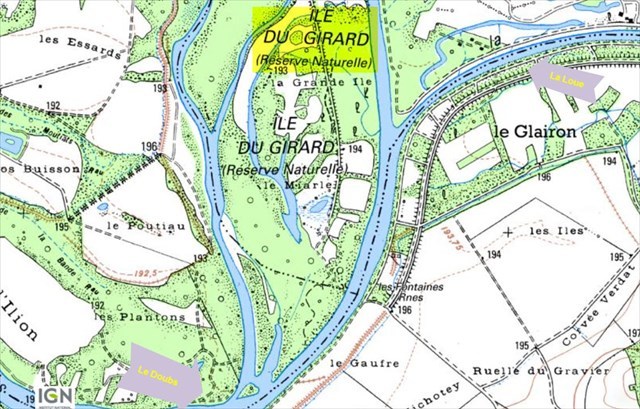 L'un des méandres court-circuité du Doubs est devenu un bras mort qui enserre l'île du Girard.