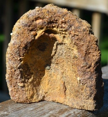 4) Continue to the Iron Oxide Laticework waypoint (about 630 feet from posted) and inspect the cliff wall as you walk. Estimate the average thickness of the bands of iron oxide running through the sandstone. You may find examples broken off at your feet. In some spots erosion has removed sand while leaving the cemented iron. Note the "stalactites" formed in these holes but look carefully as mice and cliff swallows live in some of these holes!