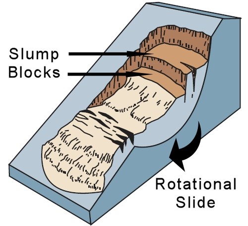 Slump Blocks and Slump Rocks: What goes up (glacial rebound) must come down (erosion/landslides). Multiple Rotational landslides or Slumps have occurred on the northern slopes of the Atlantic Highlands in the past several years. In the most recent case an unusual amount of rain saturated the slope which became too steep to hold its own weight and tons of earth, sand and rock poured down the hill into the Raritan Bay. The hills on Sandy Hook are possibly former highland slumps that have slowly moved further away from the mainland due to drifting. Here on the south side of the Highlands Ridge the sandstone is more strongly cemented but slumping has occurred over the years. Most notably, individual boulders have slumped off of the cliff on occasion and several large examples have come to rest on the beach. These boulders are now just another form of sediment!