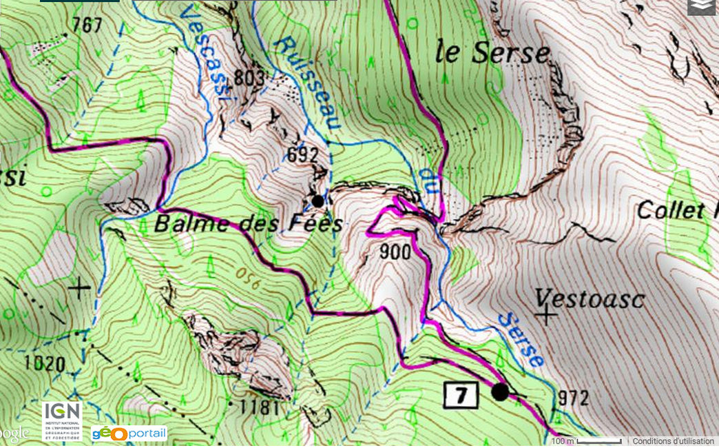 Malheureusement sur le terrain c'est beaucoup plus compliqué, le terrain est extremement escarpé et engagé. Après 1h de recherches, par manque d'équipement d'escalade pour descendre en sécurité ce petit valon, je rebrousse chemin et pose cette géocache à mon point de départ hors sentiers.