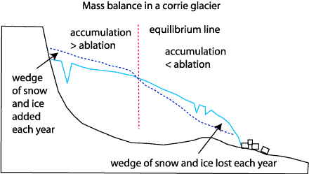 Cirques offer many opportunities to link the flow of the glacier to the processes of glacial erosion and to the form of the cirque. The flow is traditionally depicted as rotational but this style of flow can only develop once the rock basin has formed. In the early stages of cirque. deepening, it is the high through flow of ice, combined with its maximum thickness, which gives greatest erosion of the cirque floor at the equilibrium line. This allows the rock basin to be gouged out, although structural weaknesses may also be important.