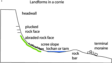 Here the features found on the former bed of the glacier can be used to identify the processes of erosion. The location and size of the zones varies considerably between corries but the sequence is a general one. The zone of deposition may rest directly on abraded bedrock - this is a reflection of the small size of the last glacier that occupied the cirque compared to earlier glaciers.