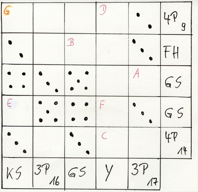 Die Angaben rechts und unten zeigen für die jeweilige Zeile bzw. Spalte an, welche Yahtzee-Formation und welche Augenzahl gesucht wird.