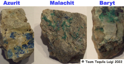 1. Sucht hier nach einem Stück Azurit, einem Stück Malachit und einem Stück Baryt.