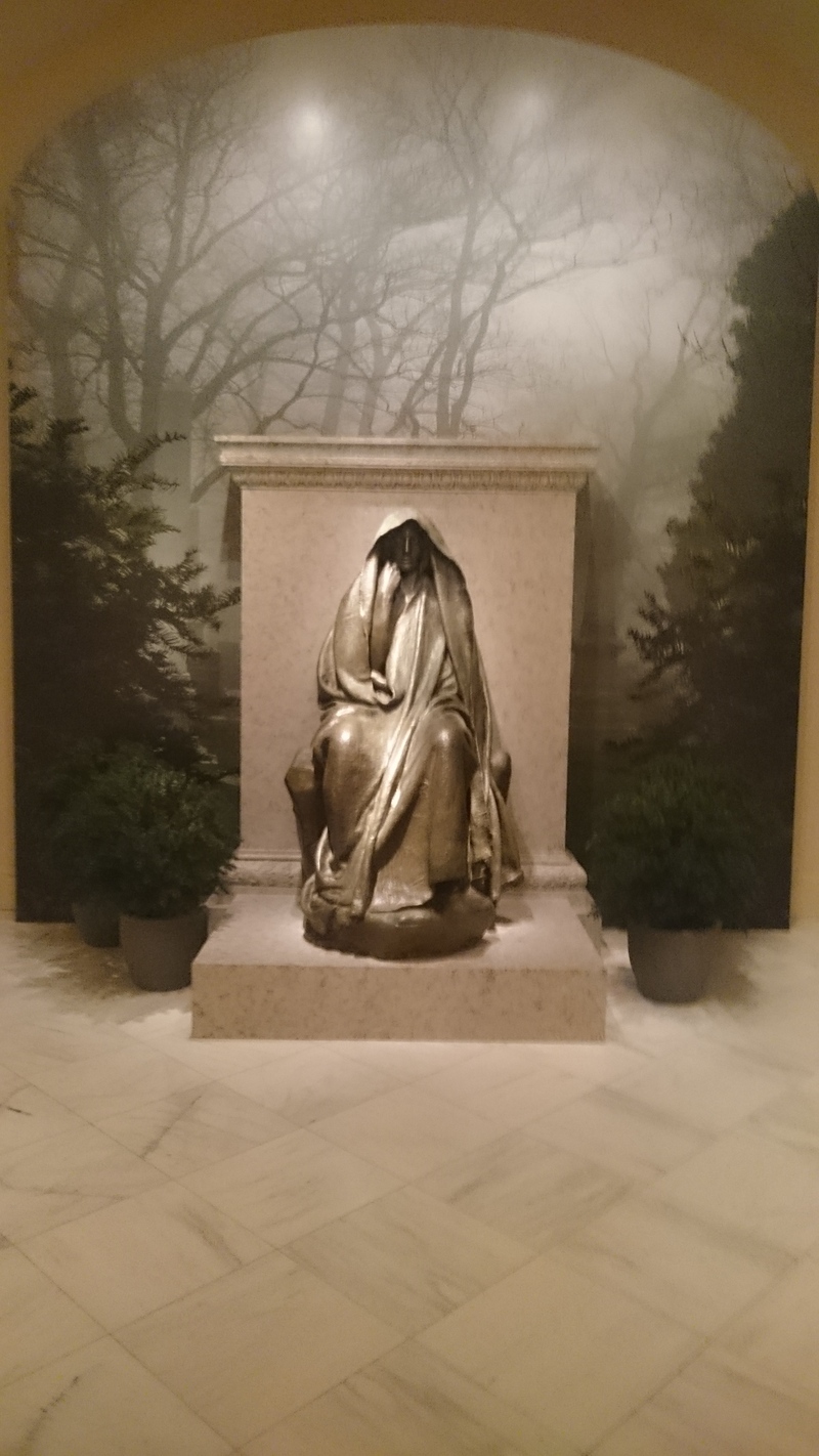 Technically, the security guard is wrong. As mentioned in the description for the Women of Rock Creek, "the shrouded being is neither male nor female, neither triumphant nor downcast. Its message is inscrutable." Although Adams initially resisted reproducing the statue, he eventually realized the power of the sculpture and allowed reproductions to be made and sold to a select few. The Smithsonian purchased this authorized reproduction in 1970.