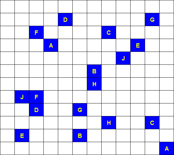 Du mußt die zwei Felder mit dem selben Buchstaben durch einen Strich verbinden. Die Teilstücke eines Striches verlaufen immer waagrecht oder senkrecht, nicht diagonal ! Eine Linie darf sich selbst und andere Linie NICHT kreuzen oder berühren. Wenn Du fertig bist, sind alle freien Felder ausgemalt. Nun geht es zur Auswertung, Du zählst die Felder der Wege zwischen den Buchstaben, die Anzahl an Feldern ergibt den Zahlenwert für den jeweilen Buchstaben (ist der Weg zwischen den beiden 'A' zum Beipiel 12 Felder, so ist A=12.