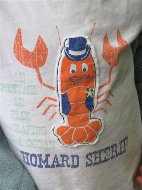 Paul, 6 ans, avec son superbe tee-shirt "Homard Sherif" est venu nous accompagner pour faire la maintenance de la cache des monstres métalliques et des bouchots.