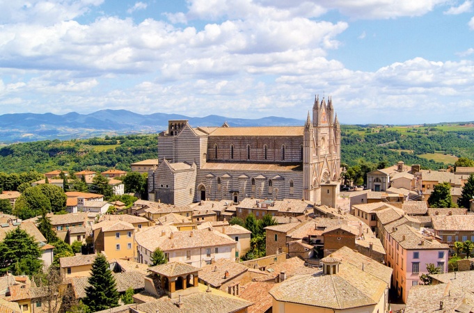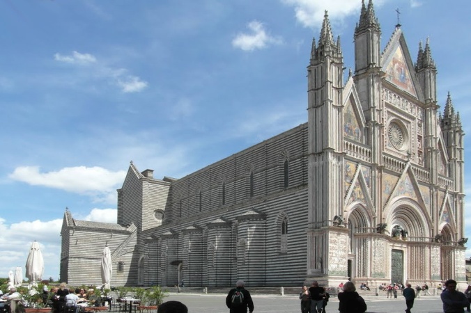 Durch die Lage der Stadt Orvieto ist das wichtigste Gebäude, der römisch-katholische Dom mit dem Patrozinium Maria Himmelfahrt, schon von Weitem zu erkennen. Der Dom gehört zu der großen Anzahl bedeutender Bauwerke, die im ausgehenden 13. Jh. geplant wurden. Er wurde 1288 wahrscheinlich unter Arnolfo di Cambio (1240–1302) begonnen, der einige Jahre später den Dom und den Palazzo Vecchio von Florenz bauen sollte. 1308 war der Rohbau ohne Dach und Fassade fertig. Die wurde nach Zeichnungen von Lorenzo Maitani im 14. Jh. vollendet.