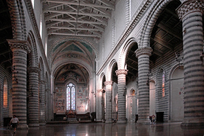 Die südliche Außenwand des Domes zeigt die typische waagerechte Schwarz-Weiß-Schichtung wie in Siena. Und auch hier hat die Fassade ein deutliches Eigenleben gegenüber dem dahinter liegenden Kirchenbau. Die gleiche Dekoration bestimmt auch den Innenraum, der auch etwas an Siena erinnert, aber nicht ganz so prachtvoll ist. Aber Orvieto hat kein steinernes Gewölbe, sondern eine hölzerne Flachdecke. Das Dach wurde 1881–90 zur 500-Jahr-Feier neu gestaltet. Die Seitenschiff-Wände waren oberhalb von zwei Metern ursprünglich weiß gestrichen, um dort Fresken anbringen zu können. Die heutige Streifung wurde erst 1890/91 in Angleichung an das Mittelschiff aufgemalt. Dieser Innenraum ist reichhaltig mit Fresken ausgestattet.