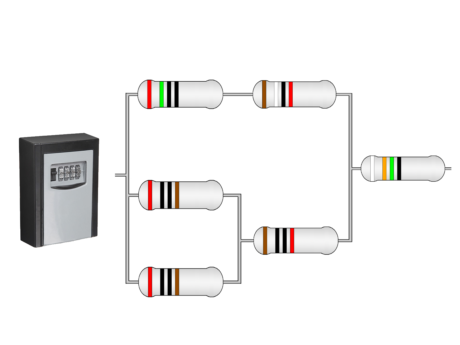 Du ser en nøgleboks med nummerhjul på, ved siden af hænger et diagram der angiver hvordan låsen er opbygget indeni.