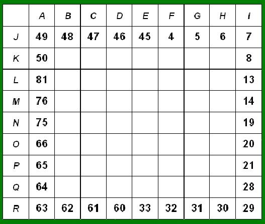 Starting anywhere, fill in the blank squares with the missing numbers so they make a path in numerical order, 1 through 81. You can work horizontally or vertically in any direction. Diagonal paths are not allowed. The puzzle is marked with columns A thru I and rows J thru R. Locate the correct number within the grid to get the coordinates.