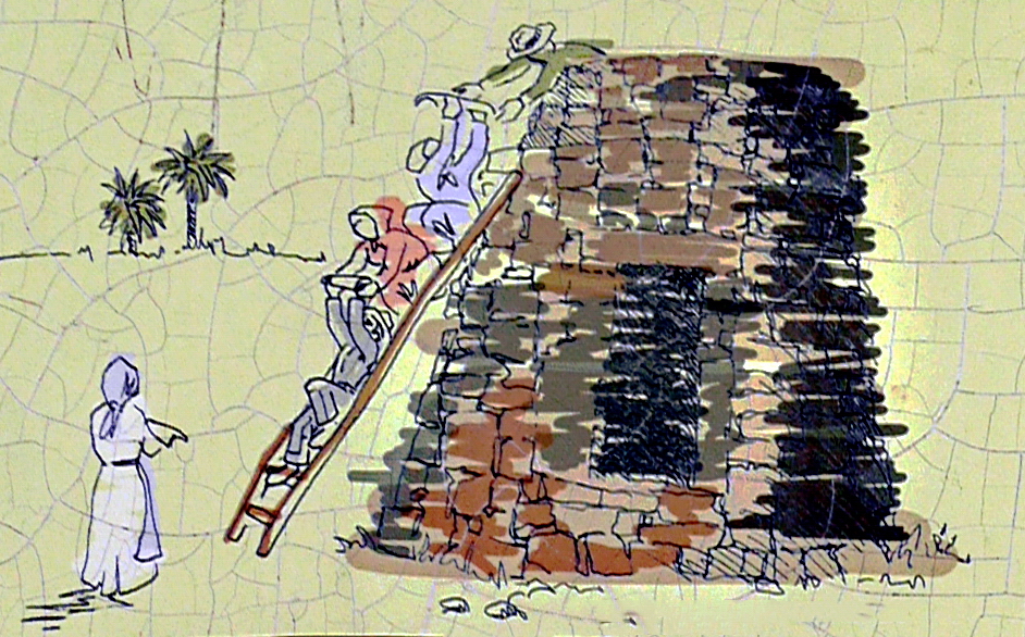 En el interior, uno de los hombres era el encargado de ir poniendo camada sobre camada, hasta llegar a lo más alto. Por fuera, hombres y mujeres sobre una escalera, se pasaban las tejas de mano en mano hasta llegar al corazón del horno. Se quemaban balos, magarzas, cardones... y el calor comenzaba a subir por entre las tejas, estando casi un día sobre el fuego hasta su completa cocción. Después había que esperar una semana para que se enfriaran. A continuación eran introducidas en cajones, que cargados en camellos comenzaban su distribución.