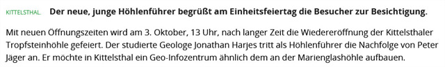 "Kittelsthaler Tropfsteinhöhle" keine Führungen mehr statt.