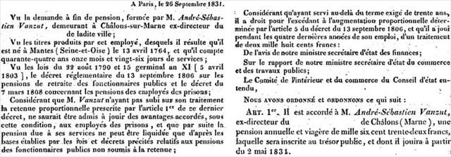 André-Sébastien VANZUT a dirigé cet établissement chalonnais, comme l’atteste le document suivant, datant du 26 septembre 1831. La somme des chiffres de l'année de naissance de la personne qui a ordonné une pension annuelle et viagère à cet ex-directeur vous donnera D.
