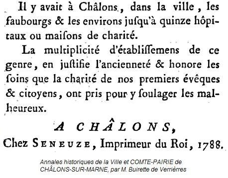 L’ordonnance du roi du 12 mai 1834 converti en hospice départemental ce lieu. Au-delà de son terme générique au niveau national, ce lieu avait un nom spécifique à Châlons-sur-Marne, lié à l’édifice d’origine acquis pour cette cause. Il s'agit d'une maison, dont le nom sans l'apostrophe ni la lettre qui la précède vous donnera B.