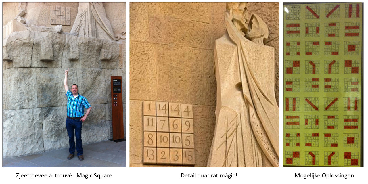 Als je de Sagrada Familia in Barcelona een bezoek brengt, zie je bij de ingang via de Façade van de Passie een zogenaamd magisch vierkant dat bestaat uit zestien vakjes met ieder een getal.Wie goed kijkt, komt al snel tot de conclusie dat de kolommen, de rijen, de diagonalen en de hoeken allemaal dezelfde som opleveren: de magische constante, in dit geval 33. Daarnaast zijn er nog verschillende symmetrische mogelijkheden die ook het getal 33 opleveren.
