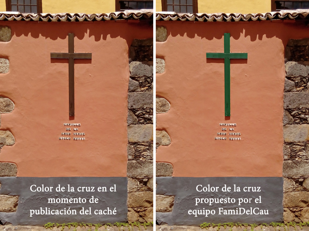 Incongruencia.Hay algo que sigo sin comprender, después de ralizar investigaciones para desarrollar esta ficha. ¿Por qué si se llama Cruz Verde está pintada de marrón?. Creo que la persona responsable de Patrimonio o el pintor en cuestión debía tener un grave problema de "daltonismo". Parece una tomadura de pelo al sentido común de los visitantes de una ciudad Patrimonio de la Humanidad como es San Cristóbal de La Laguna. Por eso proponemos, según muestra la imagen, un cambio de color de la cruz para no ser el hazmerreir de los visitantes y transeúntes.