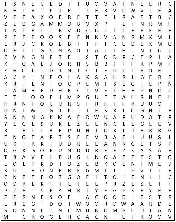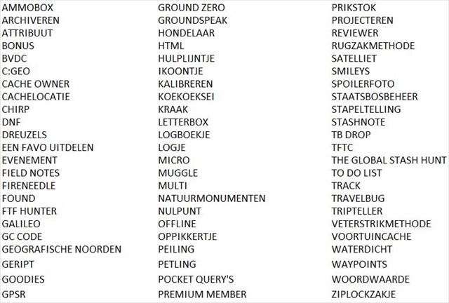De cache ligt natuurlijk niet op bovenstaande coördinaten, want dan zou hij ergens op de bodem van de Kaaivest moeten liggen. Maar het is er niet heel ver vandaan. Doe de woordzoeker en je weet waar je hem kunt vinden. De woorden zijn horizontaal, verticaal en diagonaal verborgen. Leestekens en spaties doen niet mee. Vul eventueel de Geochecker in voor groen licht. Succes!