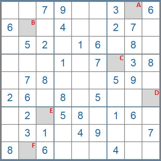 Solve the sudoku puzzle (for rules - see here). Use the numbers from the squares marked A to F to solve the following task:
