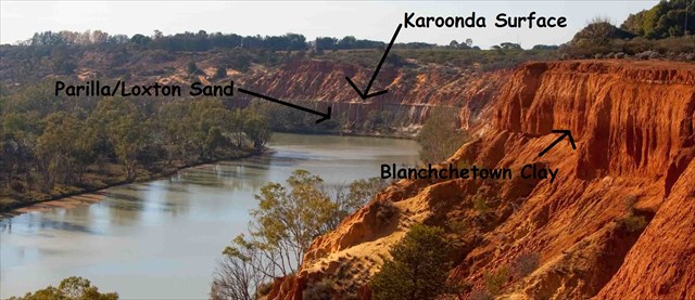 Blanchetown Clay: - Around 1.5M > 1Mbp: - Floodwater carried huge quantities of high-silicate-content sediment, which when immersed in water becomes hydrated and forms clay, into the greater Murray Basin. - In the SA/NSW border regions there is now a 15m (50ft) layer of this 'clay' lying directly atop the Karoonda Surface; and it exists to a greater or lesser degrees, throughout the rest of the Murray Basin and into Victoria. - Characteristically the stratum appears as 'pale beige' colour at the top, grading to 'Uluru-red' at the bottom. - At the same time as this clay was being deposited in the greater Murray Basins, so-called 'Ape-man' inhabited the planet.
