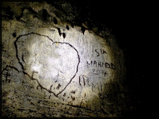 5- Dans la galerie aval (celle qui passe sous la route et qui descend vers l'océan) vous trouverez après quelques dizaines de mètres sur la paroi de gauche (malheureusement) des TAGs de visiteurs. Pour prouver votre passage, dite moi ce qu'il est inscrit dans le coeur ? voir photo ci-dessous.