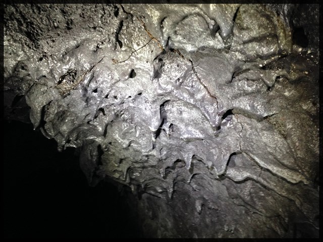 - quand la lave commence à baisser dans le tunnel, le nouveau plafond qui vient d'être dégagé est encore un peu « pâteux » et « goutte » encore
