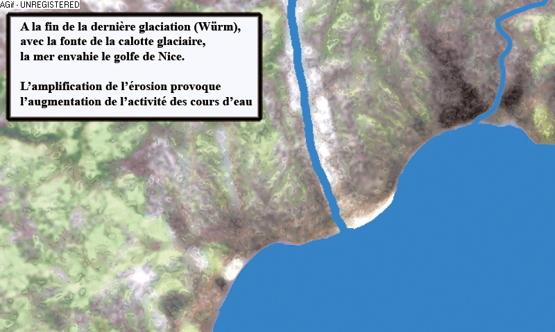 Il y a 20 000 ans, au plus fort de la dernière glaciation (Würm), le niveau de la mer sur nos côtes était situé 110 mètres plus bas qu’aujourd’hui. Il remontera progressivement avec la fonte de la calotte glaciaire jusqu’à ce que la mer envahisse le golfe de Nice. L’amplification de l’érosion à cette époque est liée au recul de la végétation, associé au changement climatique, ainsi qu’à l’augmentation de l’activité des cours d’eau. Elle a provoqué à partir de 7000 ans un apport massif de galets, socle du cordon littoral niçois