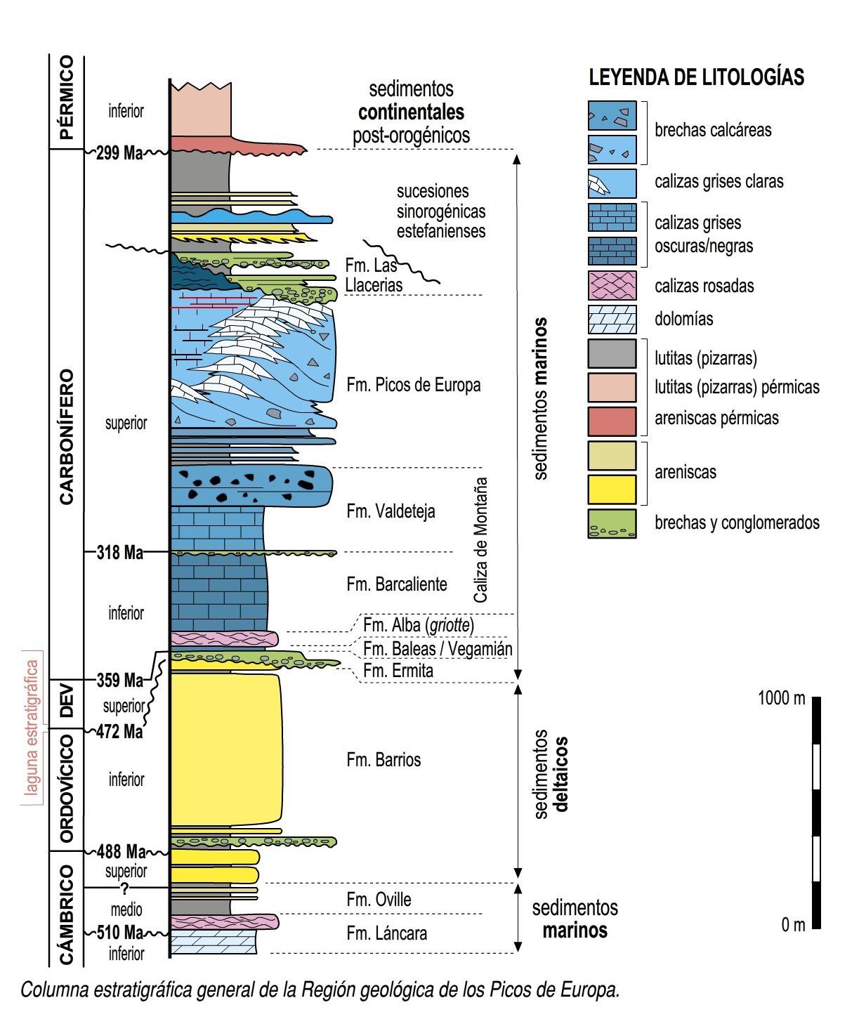 Para mostrar la sucesión de estratos que aparece en un área concreta, los geólogos recurren a su representación en una columna estratigráfica, en la que los distintos conjuntos de estratos (formaciones) aparecen con su espesor a escala y ordenados según su edad, los más antiguos en la base y los más jóvenes en la parte superior de la columna. En la siguiente página se muestra la columna que corresponde a la sucesión es-tratigráfica de la Región de los Picos de Europa. Los términos a la izquierda (Cámbrico, Ordovícico, etc.), son periodos de la historia de la Tierra pertenecientes a la Era Paleozoica; su antigüedad está indicada en millones de años. La columna coloreada del centro representa la litología (tipo de roca) de cada conjunto de estratos o formación; por ella sabemos, por ejemplo, que las rocas del Cámbrico son principalmente calizas y pizarras, o que en el Carbonífero dominan las calizas. A la derecha de esa columna se indican los nombres que han recibido cada una de las formaciones; por lo general, estos nombres hacen referencia a las localidades en las que aparecen los mejores afloramientos y en las que la formación ha sido estudiada de modo detallado.