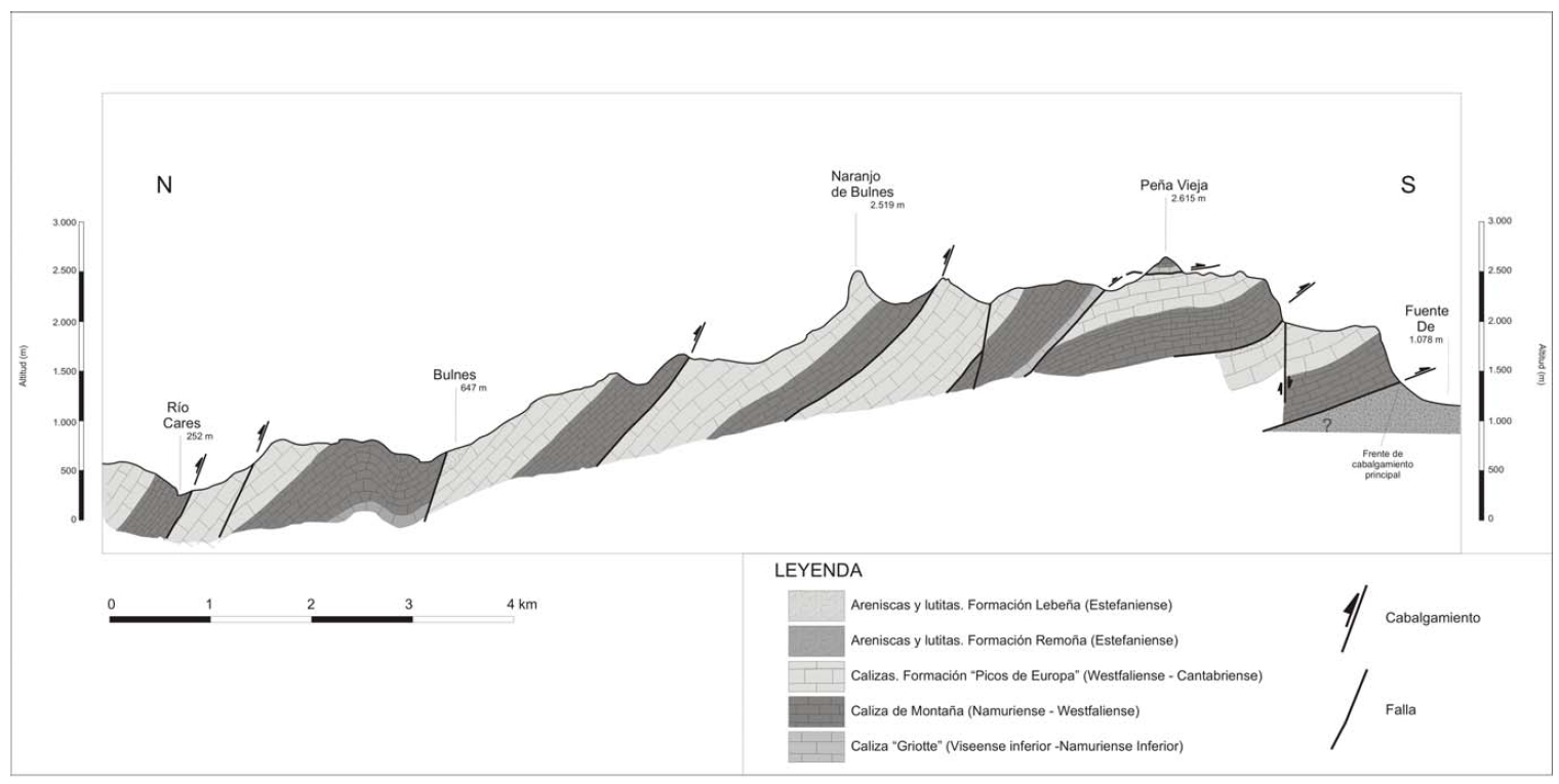 En la columna estratigráfica de los Picos de Europa destaca el gran espesor que tienen las calizas del Carbonífero, en las que se han separado, por orden de antigüedad, las formaciones Baleas, Alba, Barcaliente, Valdeteja, Picos de Europa y Las Llacerias. Como se verá en el capítulo siguiente, estas formaciones, repetidas y superpuestas por el efecto de numerosos cabalgamientos, han construido el gigantesco edificio calcáreo de los macizos de los Picos de Europa. Sus afloramientos ocupan la mayor superficie de esta región geológica y, por tanto, son ellas las que, de modo determinante, le otorgan su personalidad.