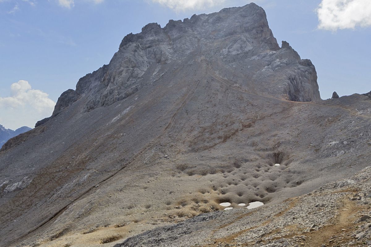 The sharp portion is formed by the limestone mountain, which generate the spurs facing south, where the upper cable car station is located. Southward thrust imbricated scales develop, in a succession of fronts and backs cabalgantes roughly retouched by modeling with a new thrust of the Picos de Europa Training on "Limestone Mountain", with training materials "Lebeña" scattered in the Butrón-Cueto Redondo and at the foot of Peña Forgotten. High block south is compartmentalized between a portion of the Picos de Europa Formation and a front thrust generated by the sector Forgotten-Peña Peña Vieja. The front is an energetic thrust morphostructure, armed by the limestone mountain, which rises more than 400 m above the surrounding materials, generating a continuous escarpment above 2300 from Peña Vieja (2615 m), Pico de Santa Ana ( 2601 m), Horcados Reds (2506 m) to Pico Treasurer (2570 m). Peña Vieja is a flake building, where the structure described above is installed a new front, as an overriding small scale or "klippe".