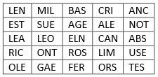 Dans le tableau suivant, chaque syllabe, sauf une, peut être jumelée à une autres syllabe qui a les mêmes lettres mais dans un autre ordre. Identifiez la syllabe unique.
