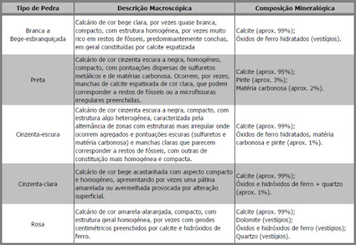 Tabela das características dos principais tipos de pedra usados na Calçada Portuguesa