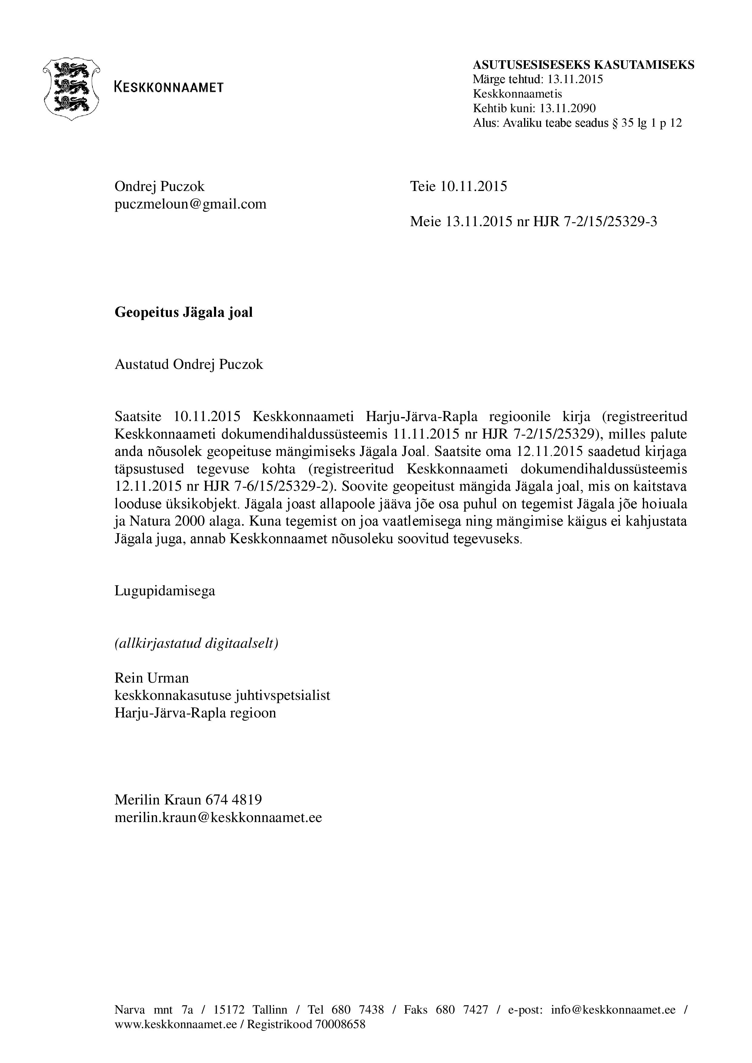 Jägala Waterfall is protected natural object. The river area, that is down from the waterfall, is a conservation area and Natura 2000 site. Since you want to observe the Jägala waterfall and the activity does not harm the waterfall, The Environmental Board gives permission for Geocaching at Jägala waterfall. Official placement permission could be found