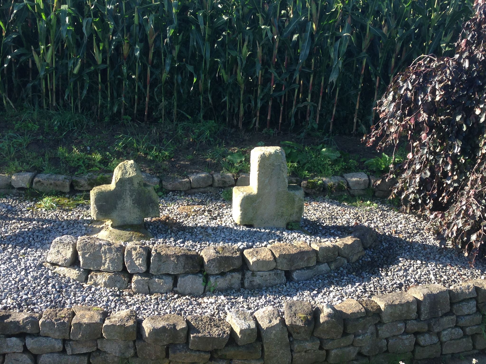 Okay, hier geht's los: Findet die Steinkreuze, die unten auf dem Bild zu sehen sind! Und dann schaut Euch das Schild an. Wann ist es aufgestellt worden? (Antwort = X, Quersumme = Y)