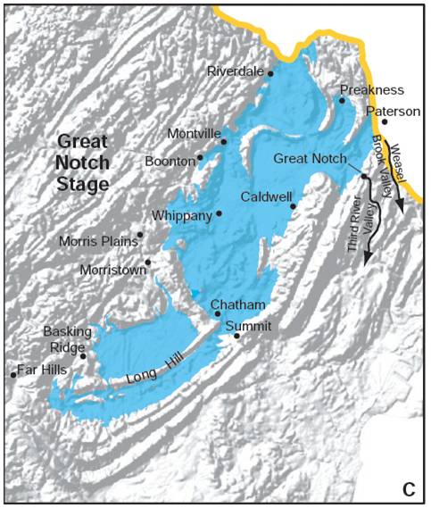 Geologically, the Great falls, as well as the modern Passaic River itself, were formed at the end of the last ice age approximately 13,000 years ago. Ice blocked rivers and formed a large lake west of the Watchung Mountains, called Glacial Lake Passaic. As glacier ice melted and receded the river's course found a new circuitous route around the north end of the Watchung Mountains. It carved the spectacular falls resulting in a dramatic cascade that tumbles over a ridge of volcanic basalt into the gorge and valley below. The river's previous course was blocked by a newly formed moraine through the underlying basalt, which was formed approximately 200 million years ago, reveling Paterson as the lower gap that is now the great falls.<>/p>
