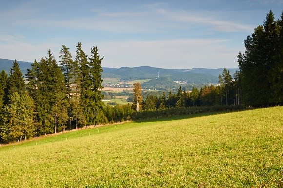 - Pokud se pozorně podíváte, tak v dolní části výhledu zahlédnete věž Kostela Panny Marie ve Velkém Poříčí. Přímo za touto věží leží nedaleko mezi poli letiště. Dále na horizontu je část pohoří Broumovské stěny. Nejvyšší viditelný vrchol je Božanovský Špičák 773m. Dále napravo je největší hora Bor 852m částečně krytá stromy v malebné pahorkaté krajině se zalesněnými kopci, který je součástí pohoří Stolové hory. Pod ním vykukuje kousek vesnice Žďárky. Pokud se pootočíte trochu doprava, vidíte polské lázeňské městečko Kudowa - Zdrój.