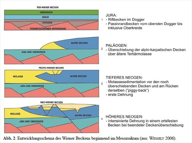 Die Tektonik des Wiener Beckens resultiert aus den zeitlich verschieden lange dauernden alpinen Überschiebungen und der dadurch entstandene Ausweitung im Gebiet zwischen den Alpen und den Karpaten. Grundsätzlich lässt sich die Formation des Wiener Beckens im Neogen (vor 23,03 bis 2,588 Millionen Jahren) in vier Etappen unterteilen: 1. Bildung eines „piggy-back“ Beckens (Eggenburgium – Karpatium), 2. Entwicklung eine „pull-apart“ Beckens (Karpatium – Pannonium), 3. Ost-West-Kompression und Beckenumkehrung (Pannonium – Pliozän) und 4. Ost-West-Ausbreitung (Pliozän – bis heute). (vgl. Strauss et. al, 2006)