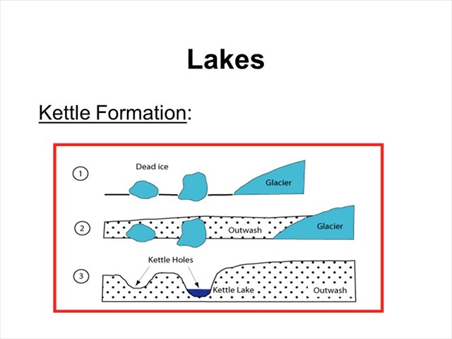 If Minnesota is the “land of 10,000 lakes,” at one time it was probably the land of thousands of chunks of ice. As glaciers moved across the land, they carried massive amounts of clay, sand, and gravel with them and left them behind. In some places this material, known as till, buried large chunks of ice broken off from the glacier. When the chunks of ice melted, the till settled, leaving depressions in the landscape. These pits then filled with water, creating many of the lakes we see around us today. Lakes formed in this way are known as kettle or ice-block lakes.