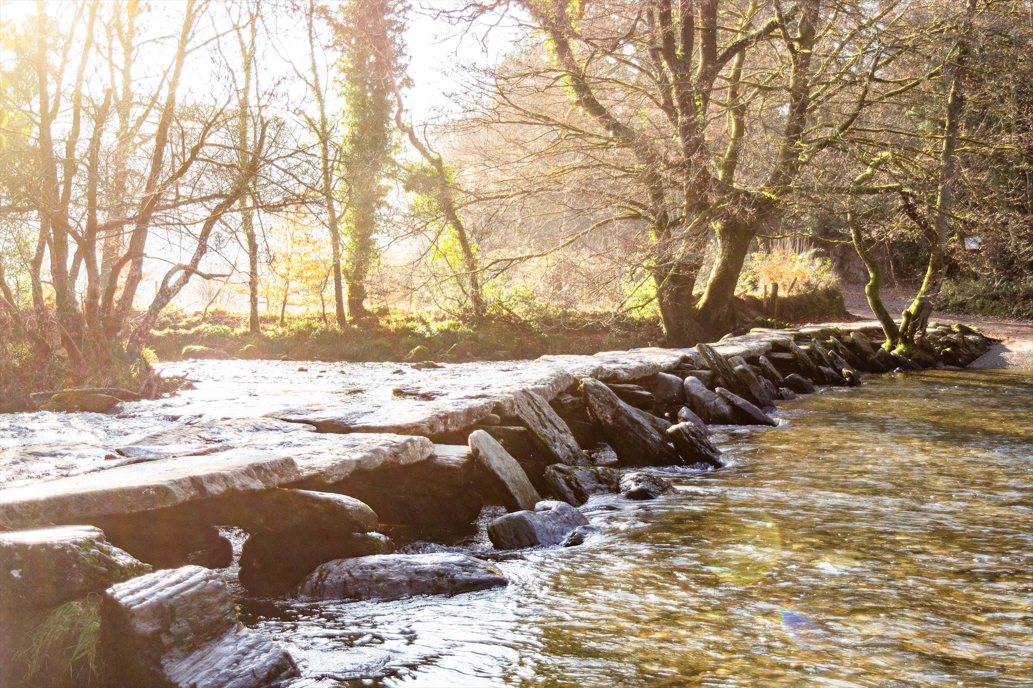 The Tarr Steps are a clapper bridge across the River Barle in the Exmoor National Park, Somerset, England. They are located in a national nature reserve about 2.5 miles (4 km) south east of Withypool and 4 miles (6 km) North West of Dulverton. A typical clapper bridge construction, the bridge possibly dates to around 1000 BC. The stone slabs weigh up to 1-2 tons apiece. According to local legend, they were placed by the devil to win a bet. Half of the bridge was washed away by the river whilst heavily swollen by rain in December 2012. The bridge has now been re-assembled.