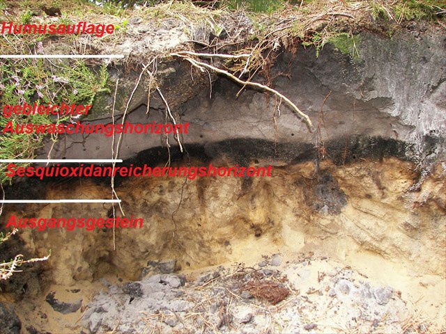 Beim bis ins 19. Jahrhundert praktizierten Plaggenhieb als Teil der Heidebauernwirtschaft wurde der Oberboden mit der Vegetation und der Wurzelzone entfernt. Zurück blieb der reine Mineralboden. Weitere Nährstoffe wurden durch Beweidung, insbesondere mit Heidschnucken entzogen. Nährstoffe wurden aus den so genutzten Böden exportiert. Niederschläge wuschen die letzten verbleibenden Nährstoffe aus, die im durchlässigen Bodenausgangsmaterial (Sande) schnell in tiefere Schichten verlagert wurden.