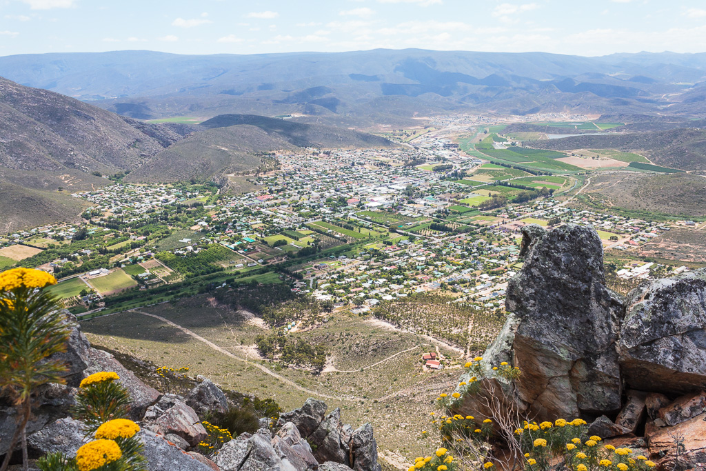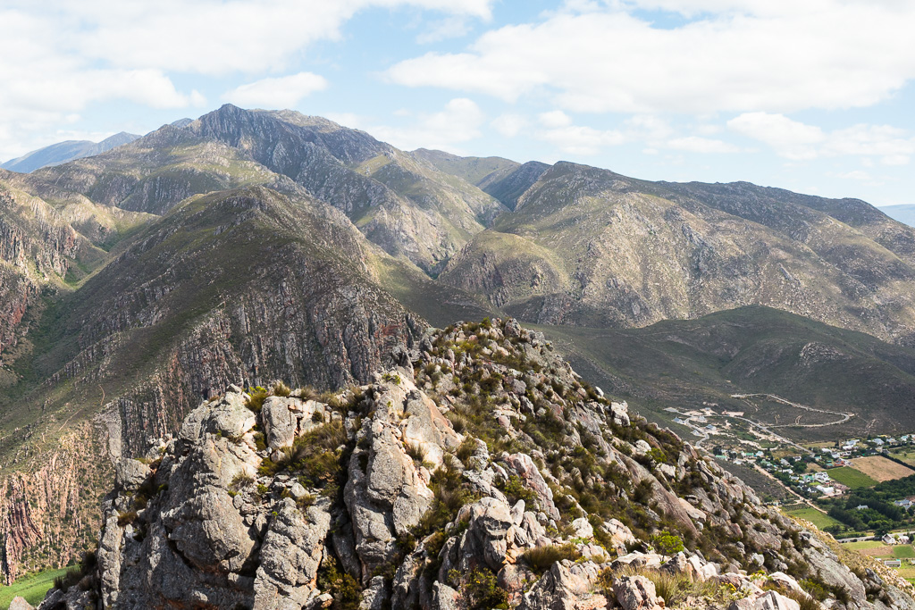 Looking up from within Cogmanskloof the cliffs looks almost impossible to scale without climbing gear. However there is an "easier" route from the other side. No climbing gear is needed there, but you will still need good climbing appendages. Once on top you'll traverse along the narrow, rocky ridge towards Bobbejaanskop before finally descending via the town name back to the start.