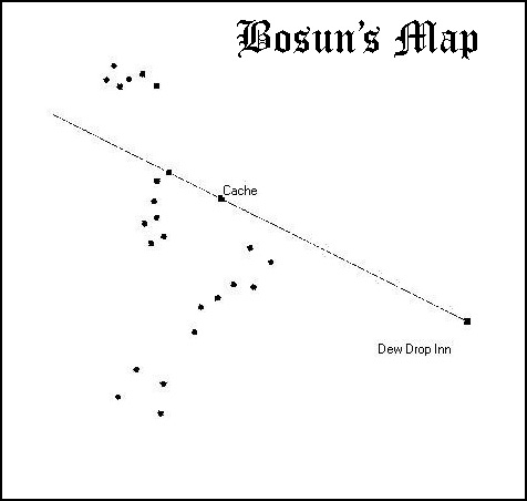 While attending a Coast Guard birthday picnic, Bosun decided to leave the base for awhile and attend the festivities across the road at the Dew Drop Inn pub. Staggering back to the picnic, Bosun decided to hide a little cache for another time. Having stayed at the pub longer than he expected, Bosun sighted in on a known object and walked 1.32 miles and hid his cache. Bosun then drew a crude map of the general area, drawing a line from the pub to the cache location to indicate his direction of travel. Can you look at Bosun's map and help him determine what direction he must travel to find his cache?