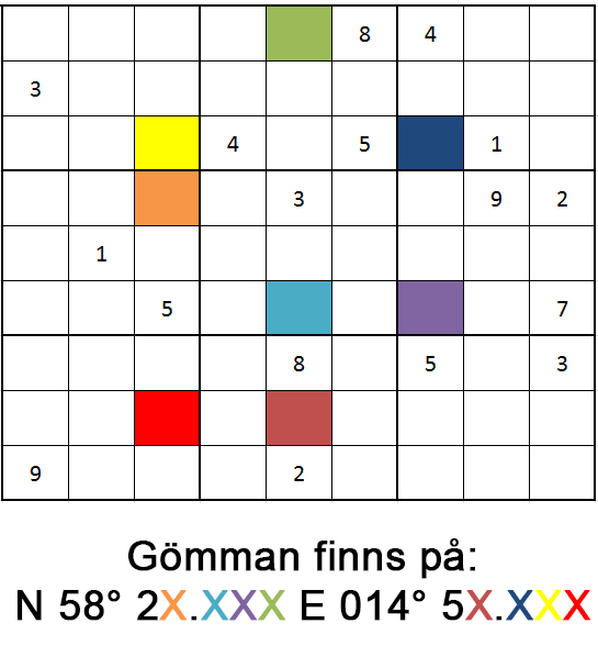 För att få koordinaterna löser ni sudokut och ersätter sedan X:en efter färgkod.