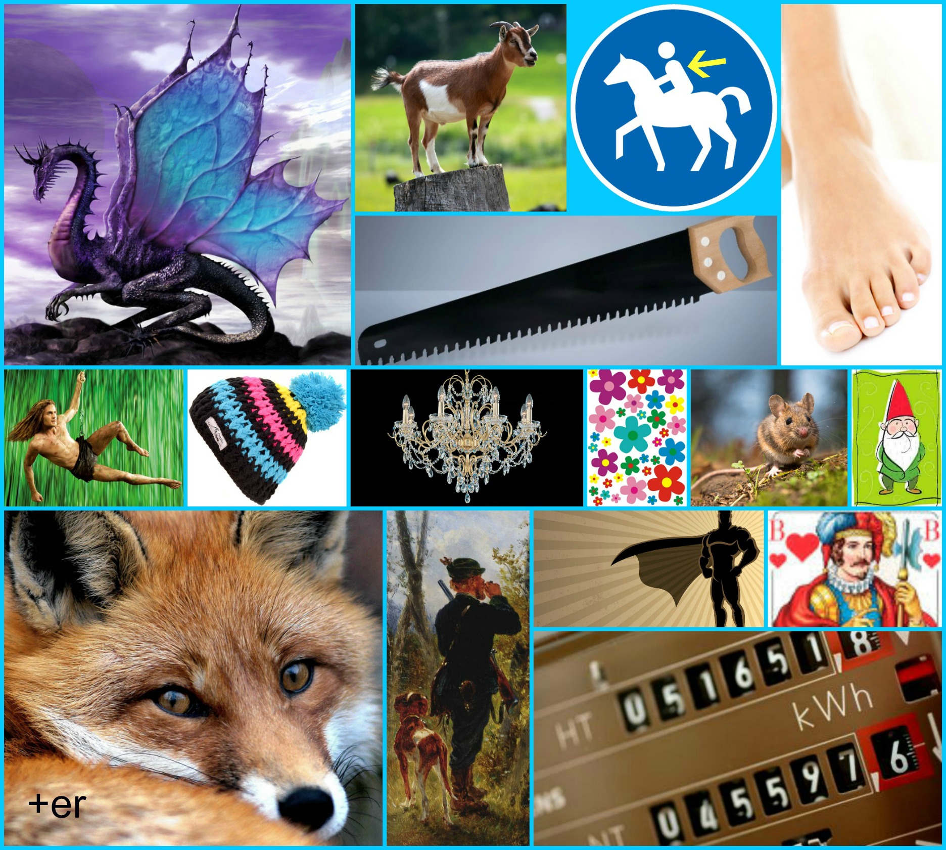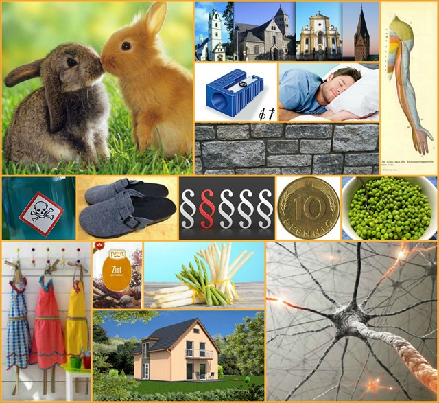Jeweils ein Bild aus der obigen Collage ergibt in Kombination mit einem Bild aus der unten stehenden Collage einen von insgesamt 16 umgangssprachlichen Begriffen.