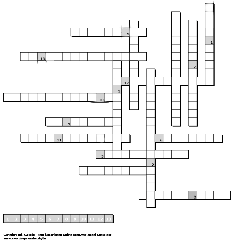 Im unten abgebildeten Gitterrätsel kannst du deine 16 Ergebnisse eintragen (ä=ae, ö=oe, usw.) und zugleich überprüfen. Wenn du alle richtig erkannt und zugeordnet hast, erhälst du im unteren linken Kästchen ein Lösungswort mit 13 Buchstaben. Nimm den Buchstabenwert (A=1, B=2, C=3, usw.) vom jeweiligen Buchstaben und setzt diese der Reihenfolge nach an der Stelle von X1-13 in die Koordinatenformel ein: