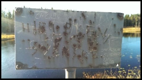På andre siden av veien hvor cachen ligger, ser du skilt som deler Norge og Sverige.