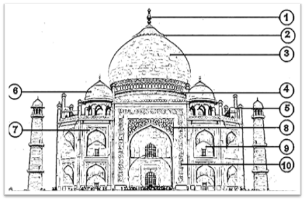 P – Elementos formais: 1 – Finial / 2 – Decorações de lótus / 3 – Amrud / 4 – Tambor / 5 – Guldasta / 6 – Chattri / 7 – Cenefas / 8 – Caligrafia / 9 – Arcadas / 10 – Dados