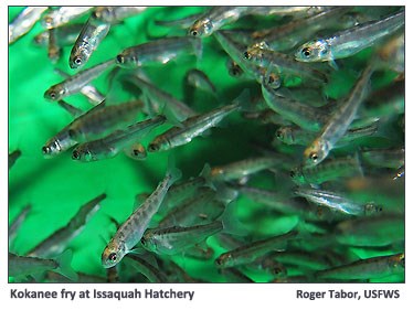 Lack of suitable spawning areas are a major limiting factor, so to help keep the Lake Sammamish kokanee from going extinct, each fall since 2009, WDFW biologists have collected adult kokanee from three local streams and artificially spawned them at the hatchery. Once the eggs hatch in the spring, the fry are released to make their way to Lake Sammamish, where they mature into adult kokanee and hopefully return to their native creeks to spawn.