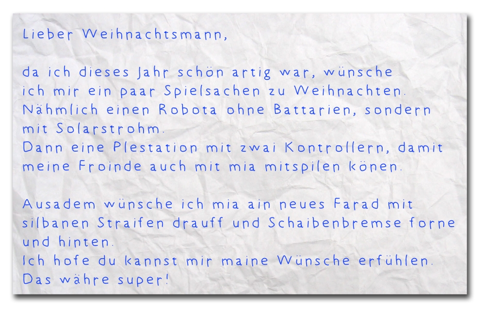 Neulich erreichte den Weihnachtsmann folgender Wunschzettel; auf den ersten Blick sah alles ganz 'normal' aus, doch so wie es scheint muss es das Kind eines Geocachers gewesen sein :D