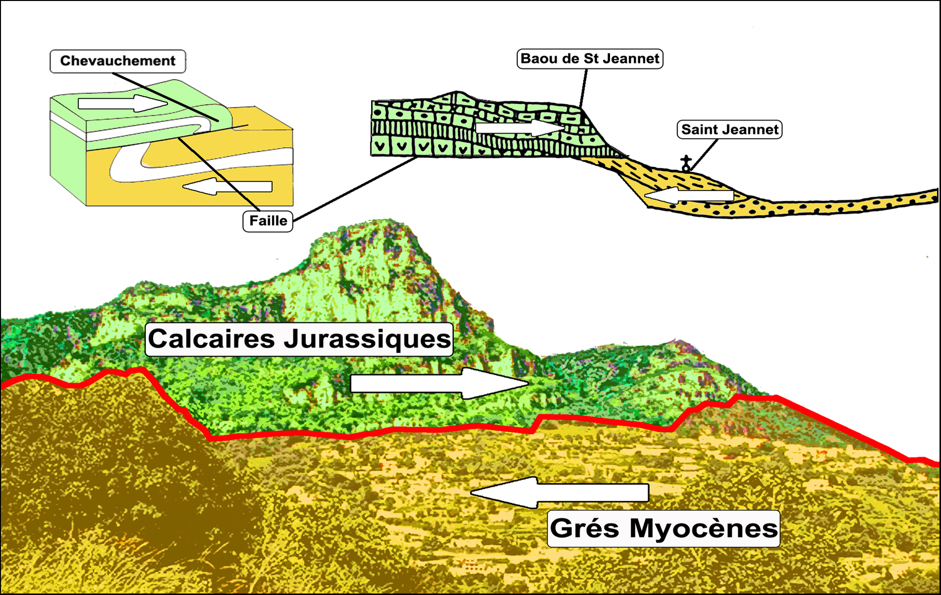Le contact anormal se fait par un plan de chevauchement : les calcaires jurassiques chevauchent par une faille à faible pendage sur les grès molassiques miocènes.